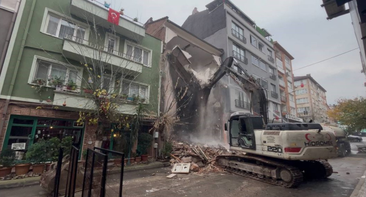 Bursa'da yeni yapı için yıkılacak olan 4 katlı eski bina, iş makinesi tarafından ilginç yöntemle yerle bir edildi. Binanın çatısından başlayacağına, zemininden başlayınca ortalık savaş alanına döndü.