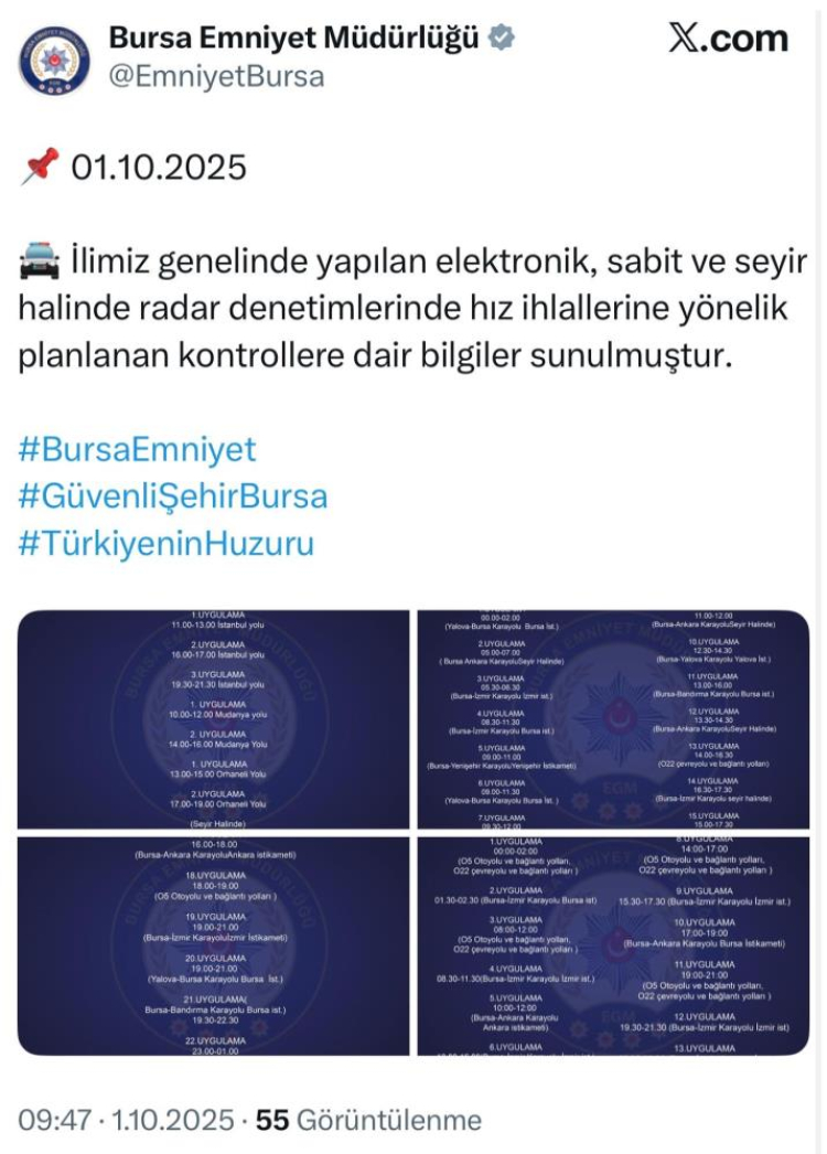 Bursa İl Emniyet Müdürlüğü, il genelinde gerçekleştirilen elektronik, sabit ve seyir halinde yapılan radar denetimlerine ilişkin yeni bir uygulamaya geçti. Buna göre Emniyet Müdürlüğü'nün sosyal medya hesaplarından denetim yapılacak noktalar ve saatleri açıklandı.