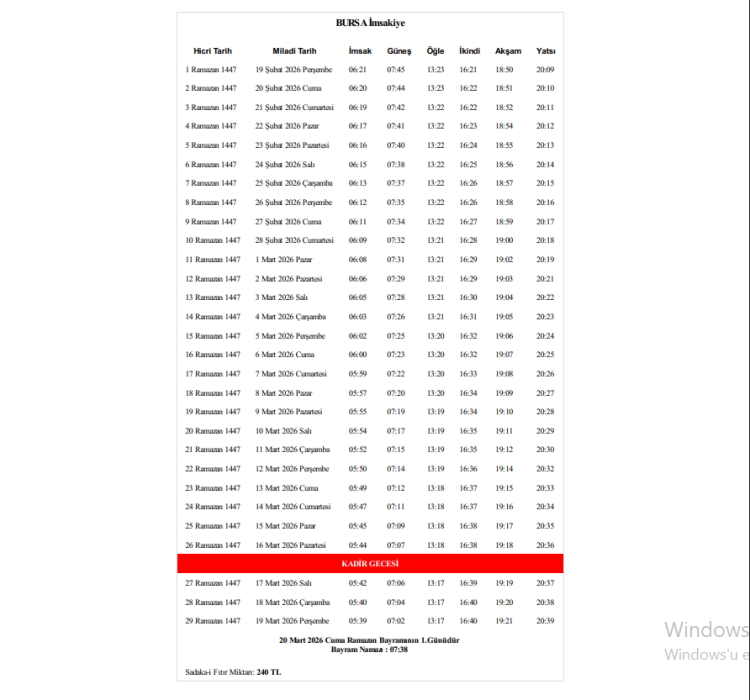 BURSA RAMAZAN İMSAKİYE 2026