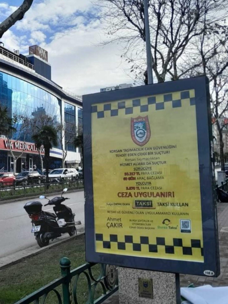 Bursa'da korsan taşımacılıkla mücadele için bilgilendirme afişleri asıldı. Afişlerde korsan taşımacılığın ciddi suç olduğu ve yüksek cezalarla karşılaşılabileceği vurgulandı. Sürücü ve yolcu cezaları hatırlatıldı, lisanslı taksiler önerildi.