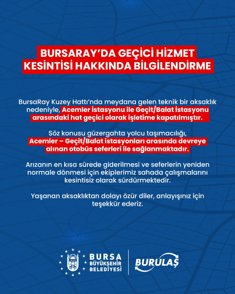 Yetkililer tarafından yapılan açıklamada, söz konusu güzergahta mağduriyet yaşanmaması adına otobüs takviyesinin hızla devreye alındığı belirtildi. Buna göre, Acemler ile Geçit/Balat arasında ulaşım geçici olarak otobüs seferleriyle sağlanıyor.