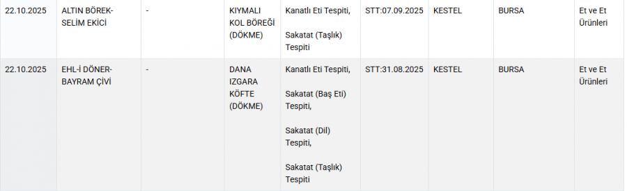 Bakanlığın denetimleri sonucunda, Kestel ilçesinde faaliyet gösteren “Ehl-i Döner” ve “Altın Börek – Selim Ekici” adlı işletmelerin ürünlerinde kanatlı eti ve sakatat tespit edildi. Et dönerin kırmızı etten yapılması gerekirken, bu işletmelerin ürünlerinde farklı tür etlerin kullanılması tüketicinin yanıltılması olarak değerlendirildi.