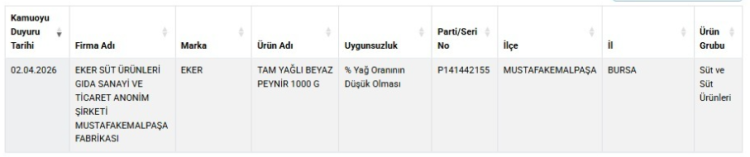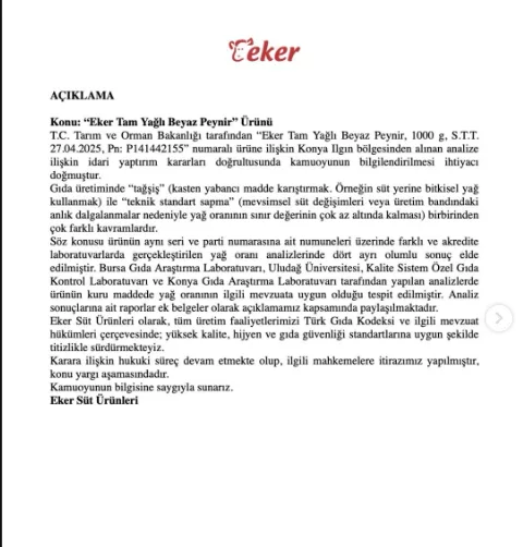 "T.C. Tarım ve Orman Bakanlığı tarafından "Eker Tam Yağlı Beyaz Peynir, 1000 g, S.T.T. 27.04.2025, Pn: P14144215" numaralı ürüne ilişkin Konya Ilgın bölgesinden alınan analize ilişkin idari yaptırım kararları doğrultusunda kamuoyunun bilgilendirilmesi ihtiyacı doğmuştur.