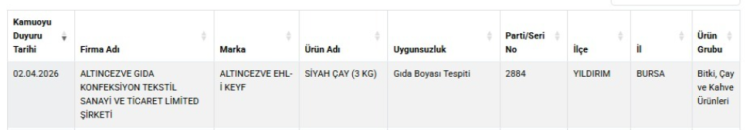 Buna göre, Eker Süt Ürünleri Gıda Sanayi ve Ticaret A.Ş. Mustafakemalpaşa’daki fabrikasında üretilen 1000 gramlık tam yağlı beyaz peynirde yağ oranının düşük olduğu belirlendi. Diğer yandan, Altıncezve Gıda Konfeksiyon Tekstil Sanayi ve Ticaret Ltd. Şti. tarafından üretilen Ehl-i Keyf markalı 3 kilogramlık siyah çaya ise gıda boyası katıldığı tespit edildi.