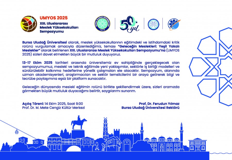 Bursa Uludağ Üniversitesi (BUÜ) 50. yılında geleceğin mesleki eğitim yöntemlerinin ele alınacağı Uluslararası Meslek Yüksekokulları Sempozyumu'na (UMYOS) ev sahipliği yapacak.