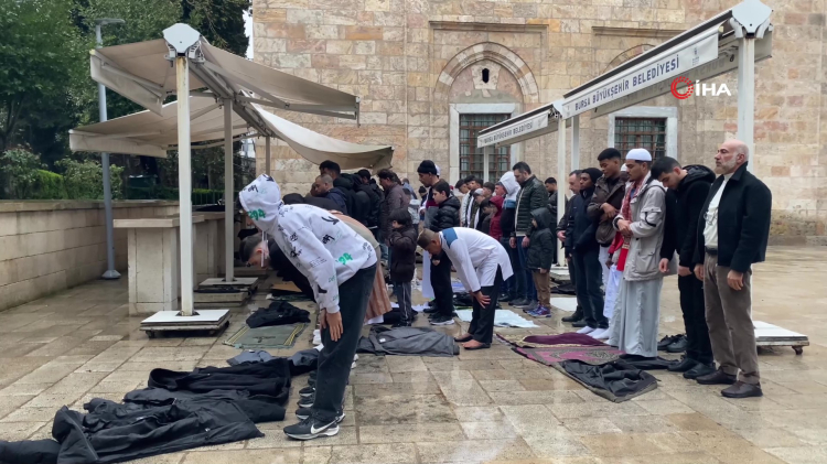 Bursa’da bayram namazı için binlerce kişi tarihi Bursa Ulu Camii’ne akın etti. Cami kısa sürede dolarken, yer bulamayan birçok vatandaş yağmura rağmen avluda namaz kıldı.