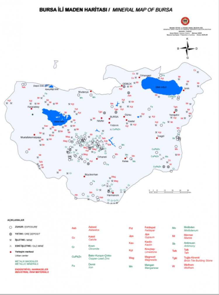 Yukarı yer alan haritada, Bursa ili sınırları içindeki maden ve ruhsatlı ocakların dağılımını, Nilüfer ilçesi ve baraj havzası çevresindeki bölgeler net şekilde gösteriliyor.