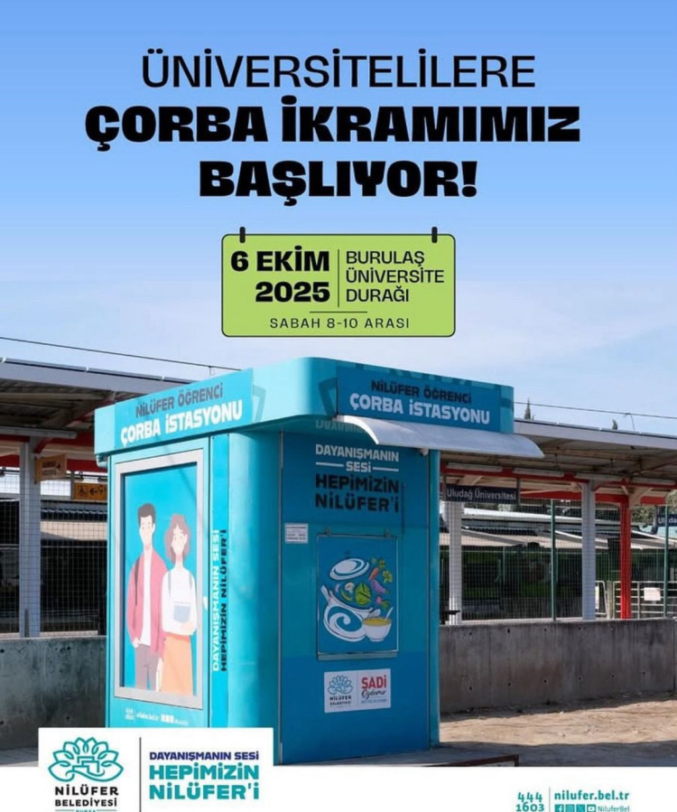 6 Ekim 2025’ten itibaren, her sabah 08.00-10.00 saatleri arasında Üniversite Durağı ile Bursa Uludağ güzergahında yolculuk yapan öğrencilere, Üniversite KYK Kız Yurdu yanında sıcak çorba ikram yapılacak.