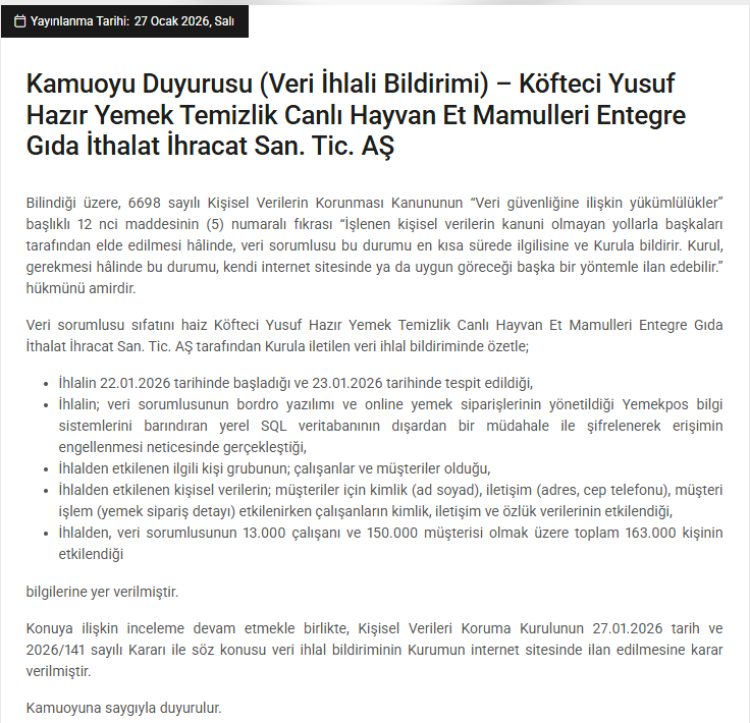 KVKK tarafından yapılan açıklamada, Köfteci Yusuf Hazır Yemek Temizlik Canlı Hayvan Et Mamulleri Entegre Gıda İthalat İhracat San. Tic. AŞ’ye ait bilgi sistemlerinde yaşanan veri ihlaline ilişkin kamuoyunun bilgilendirildiği belirtildi.