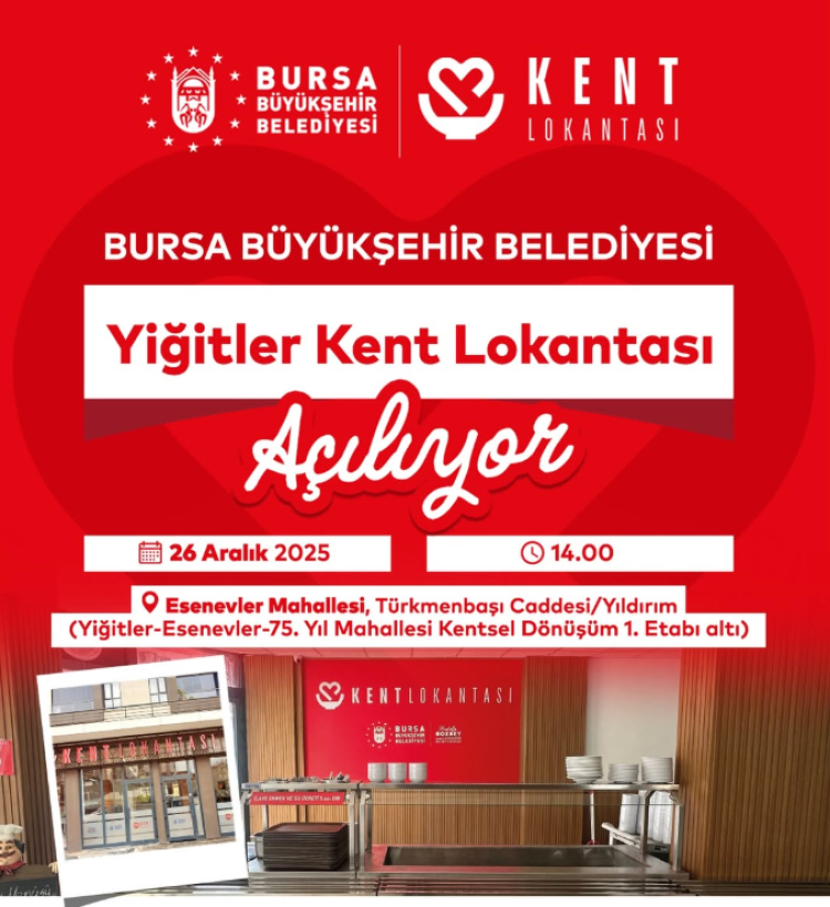Belediyeden yapılan açıklamaya göre, Yıldırım ilçesinde önemli bir ihtiyacı karşılayacak olan Yiğitler Kent Lokantası, 26 Aralık 2025 Cuma günü saat 14.00’te kapılarını açacak. Lokantada 4 çeşit yemek, sadece 80 TL’den satışa sunulacak.