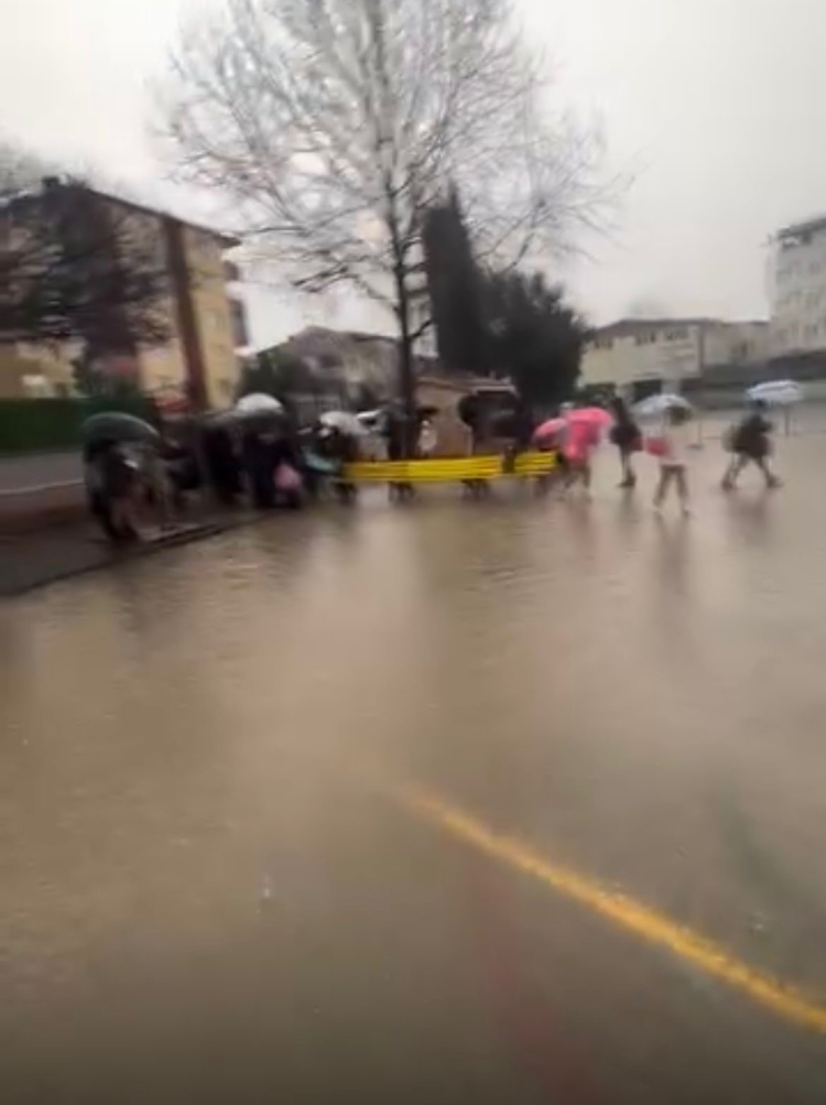 Olay Mahmudiye Mahallesi'nde eğitim öğretime devam eden Müşerref Muzaffer Samda İlkokulu bahçesinde meydana geldi. Yoğun yağış nedeniyle okulun bahçesi göle döndü. Veliler öğrencileri okuldan çıkarmak için bankları sıralayıp geçirdiler