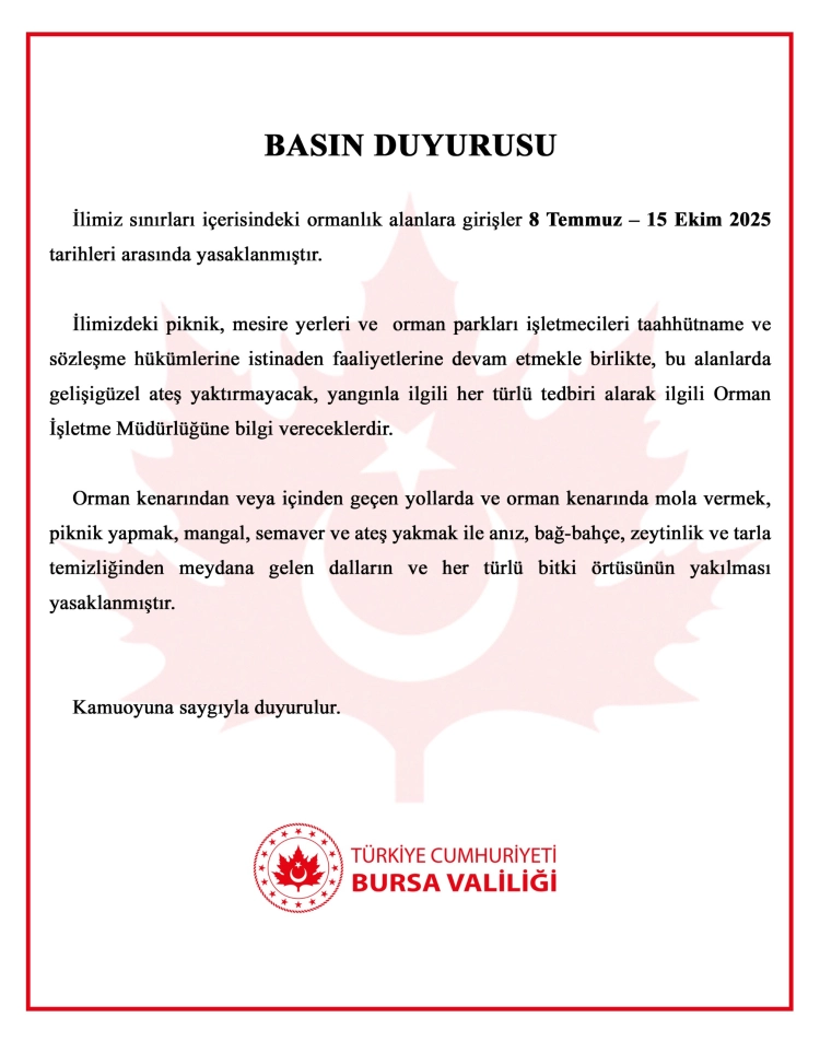 Bursa Valiliği tarafından yapılan açıklamada, "Bursa sınırları içerisindeki ormanlık alanlara girişler 8 Temmuz–15 Ekim 2025 tarihleri arasında yasaklanmıştır. Bursa’daki piknik, mesire yerleri ve orman parkları işletmecileri taahhütname ve sözleşme hükümlerine istinaden faaliyetlerine devam etmekle birlikte, bu alanlarda gelişigüzel ateş yaktırmayacak, yangınla ilgili her türlü tedbiri alarak ilgili Orman İşletme Müdürlüğüne bilgi vereceklerdir. Orman kenarından veya içinden geçen yollarda ve orman kenarında mola vermek, piknik yapmak, mangal, semaver ve ateş yakmak ile anız, bağ-bahçe, zeytinlik ve tarla temizliğinden meydana gelen dalların ve her türlü bitki örtüsünün yakılması yasaklanmıştır" denildi.