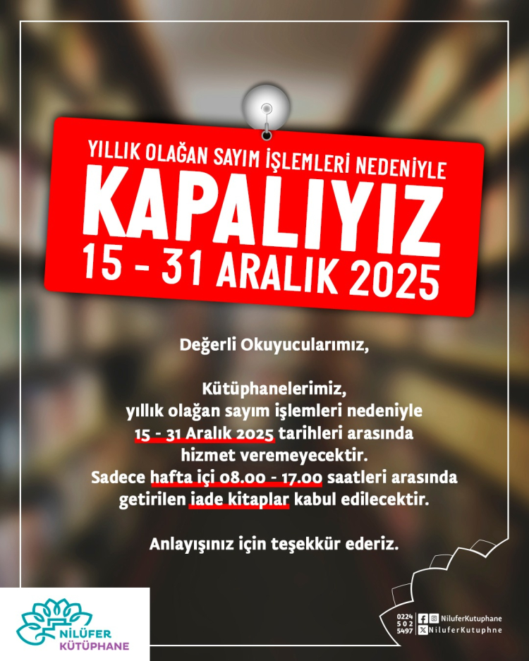 Nilüfer Belediyesi Kütüphaneleri, 15-31 Aralık 2025 tarihleri arasında yapılacak yıllık olağan sayım işlemleri nedeniyle hizmete ara verecek.