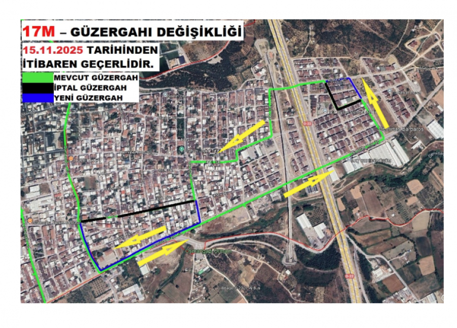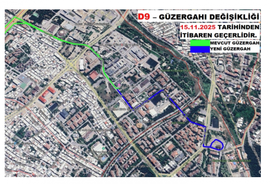 “17M ve D9 hatlarına ait güzergah değişiklikleri 15.11.2025 tarihinden itibaren geçerlidir. Yeni, mevcut ve iptal edilen duraklar görsellerde detaylı şekilde gösterilmiştir. Vatandaşlarımızın ulaşım planlarını bu doğrultuda yapmaları önemle rica olunur. Kamuoyuna saygıyla duyurulur.”