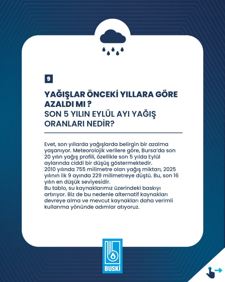 2010 yılında 755 mm olan yağış miktarı, 2025’in ilk 9 ayında 229 mm’ye düştü. BUSKİ, bu durumun su kaynakları üzerindeki baskıyı artırdığını, bu nedenle alternatif kaynak devreye alma çalışmalarına hız verildiğini belirtti.