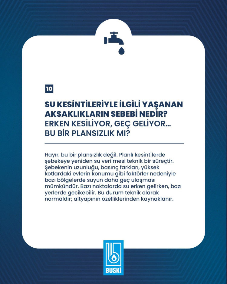 “Şebekenin uzunluğu, basınç farkları ve yüksek kotlardaki evlerin konumu gibi nedenlerle bazı bölgelerde su daha geç ulaşabilir. Bu durum teknik olarak normaldir.”
