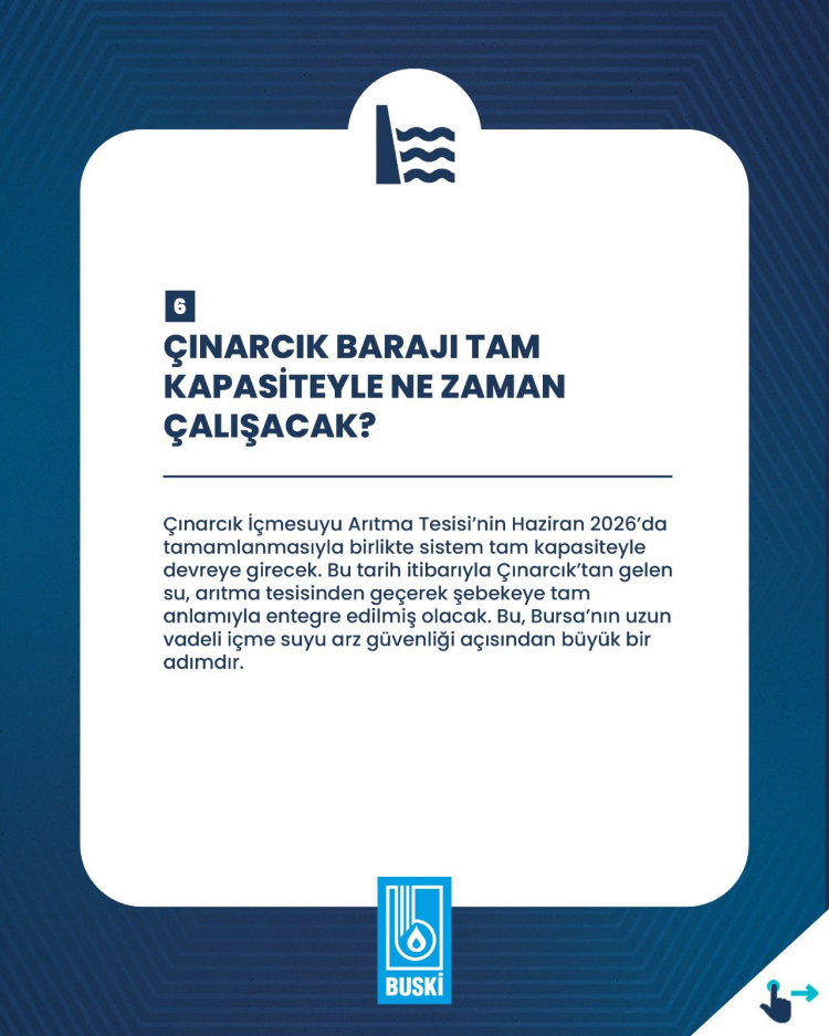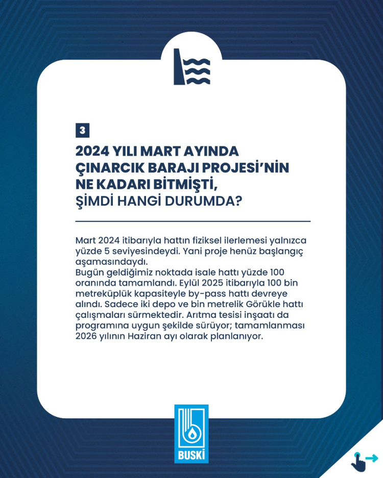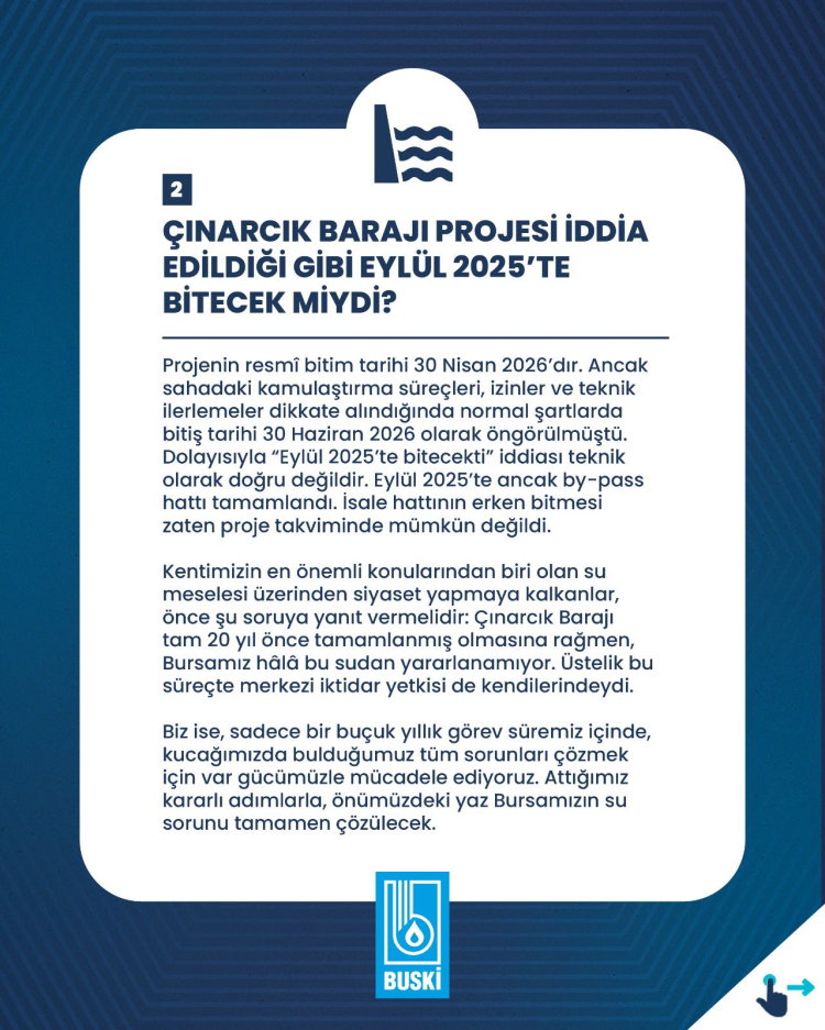 Bursa Su ve Kanalizasyon İdaresi (BUSKİ), Çınarcık Barajı İsale Hattı Projesi'nin durmadığını ve planlı ilerlediğini açıkladı. 2024'te %5 olan hattın tamamlanmasını 2026 için planlıyor ve by-pass hattı önemli bulunuyor. Su azlığı nedeniyle kesintiler sürüyor.