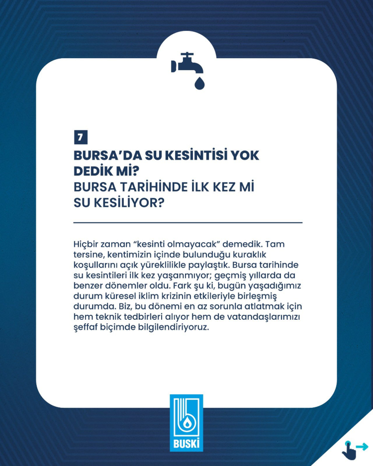 BUSKİ, “Bursa’da su kesintisi olmayacak” şeklinde bir açıklama yapmadıklarını, aksine kuraklık koşullarını vatandaşlarla açıkça paylaştıklarını belirtti: