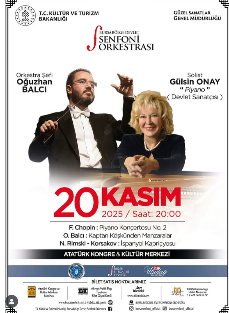 Türk çoksesli müziğinin önemli isimlerinden Devlet Sanatçısı Piyanist Gülsin Onay ve Besteci/Şef Oğuzhan Balcı, Bursa Bölge Devlet Senfoni Orkestrası (BBDSO) ile aynı sahnede buluşuyor.