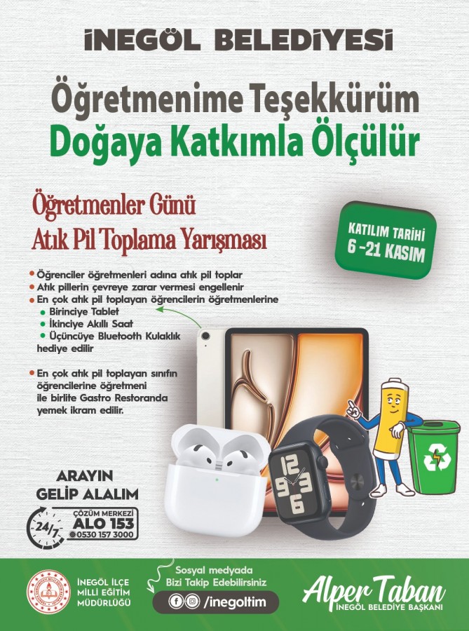 İnegöl Belediyesi, 24 Kasım Öğretmenler Günü için atık pil toplama kampanyası başlattı. Öğrencilerin öğretmenleri adına atık pil toplayarak katılacağı yarışmada, ilk 3'e giren sınıfların öğretmenlerine hediyeler verilecek. Birinci olan sınıfa ayrıca öğretmeniyle birlikte Gastro İnegöl'de yemek ikram edilecek.