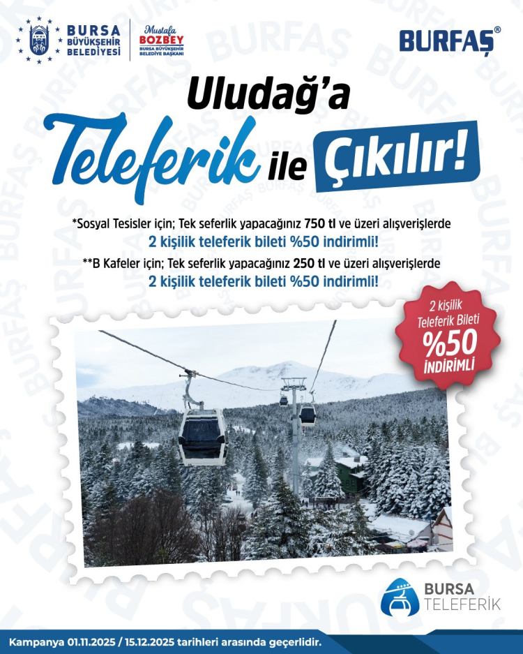 Yapılan açıklamaya göre, BURFAŞ Sosyal Tesisleri'nde 750 TL ve üzeri, B Kafelerde ise 250 TL ve üzeri alışveriş yapan misafirlere 2 kişilik teleferik bileti için %50 indirim fırsatı sunuluyor.