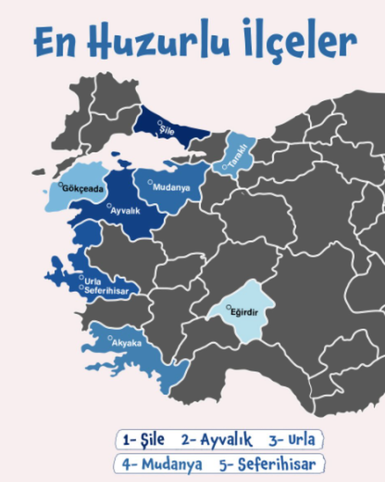 Listede Bursa’dan yer alan tek ilçe Mudanya oldu. Doğal güzellikleri, sakin yaşam tarzı ve Marmara Denizi’ne uzanan sahil hattıyla öne çıkan Mudanya, Türkiye genelinde 4’üncü sırada yer aldı.