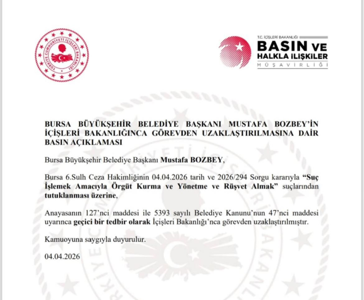 Bakanlık tarafından yapılan resmi açıklamada, Bursa 6. Sulh Ceza Hakimliği’nin 4 Nisan 2026 tarihli kararı doğrultusunda Bozbey’in tutuklandığı hatırlatıldı.
