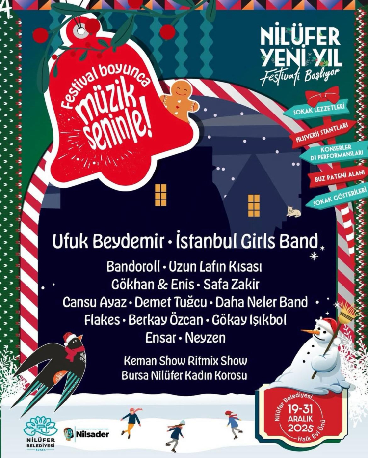 Nilüfer Belediyesi, 2025’e coşkuyla girmeye hazırlanıyor. 19–31 Aralık tarihleri arasında Nilüfer Belediyesi Halk Evi önünde düzenlenecek yılbaşı festivali, her yaştan vatandaşa unutulmaz bir yeni yıl deneyimi sunacak.