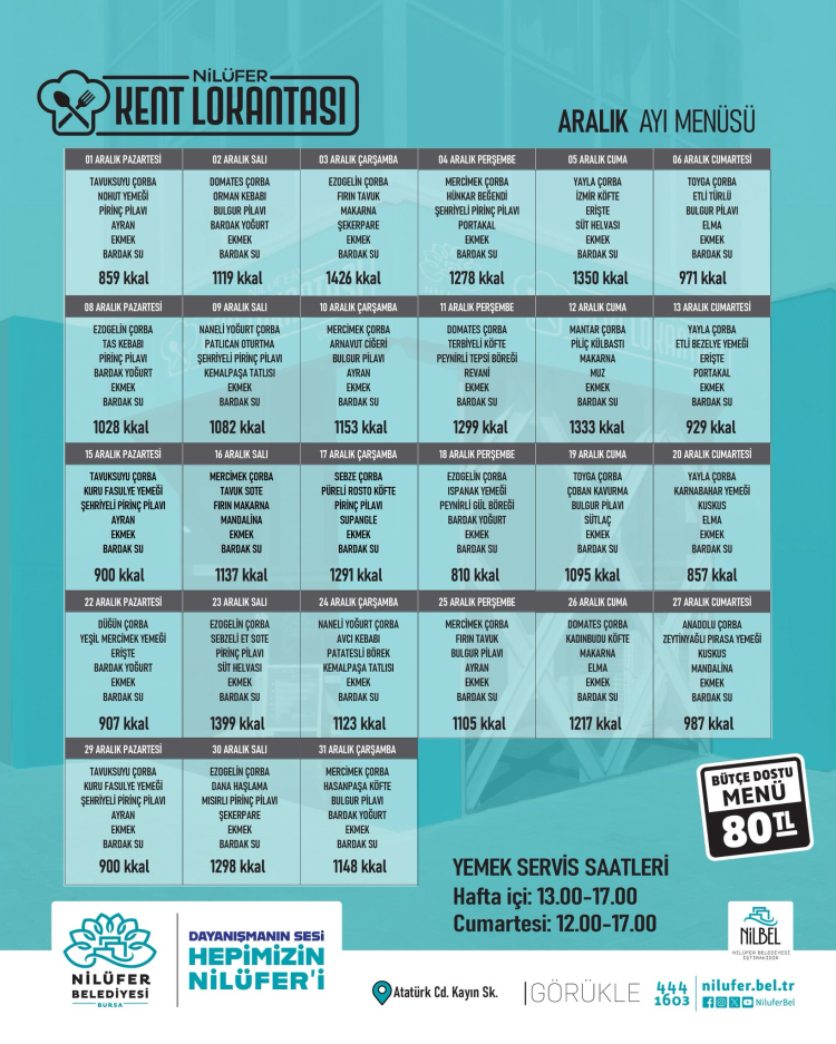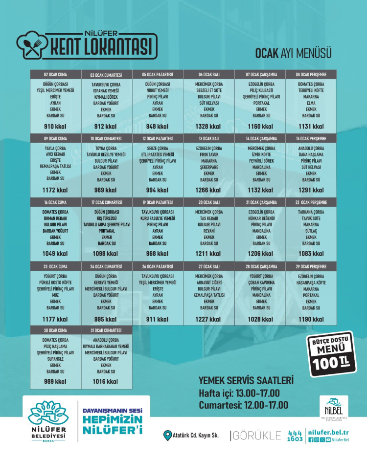 Yılın ilk günü kapalı olacak olan Nilüfer Kent Lokantası, 2 Ocak 2026 tarihi itibarıyla zamlı tarifeyle hizmet vermeye başlayacak. Lokanta, hafta içi 13.00-17.00, cumartesi günleri ise 12.00-17.00 saatleri arasında yemek servisi yapıyor.