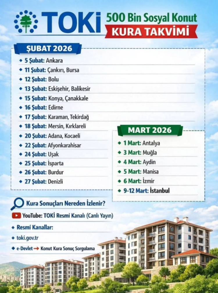 Kura çekimiyle birlikte projede yer alan konutlar için asil ve yedek hak sahipleri belirlenecek. Sonuçlar, aynı gün TOKİ'nin resmi internet sitesi ve e-Devlet Kapısı üzerinden T.C. kimlik numarası ile sorgulanabilecek.