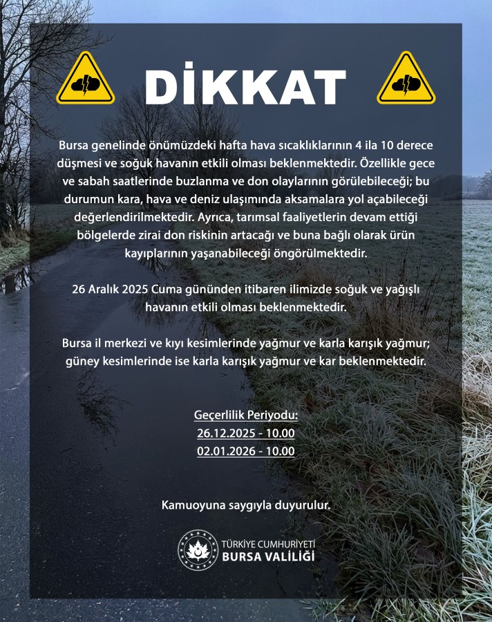 "Bursa genelinde önümüzdeki hafta hava sıcaklıklarının 4 ila 10 derece düşmesi ve soğuk havanın etkili olması beklenmektedir. Özellikle gece ve sabah saatlerinde buzlanma ve don olaylarının görülebileceği; bu durumun kara, hava ve deniz ulaşımında aksamalara yol açabileceği değerlendirilmektedir. Ayrıca, tarımsal faaliyetlerin devam ettiği bölgelerde zirai don riskinin artacağı ve buna bağlı olarak ürün kayıplarının yaşanabileceği öngörülmektedir.