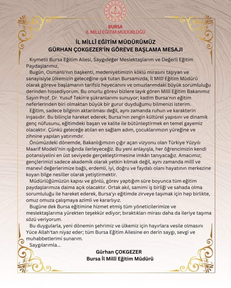 "Kıymetli Bursa Eğitim Ailesi, Saygıdeğer Meslektaşlarım ve Değerli Eğitim Paydaşlarımız