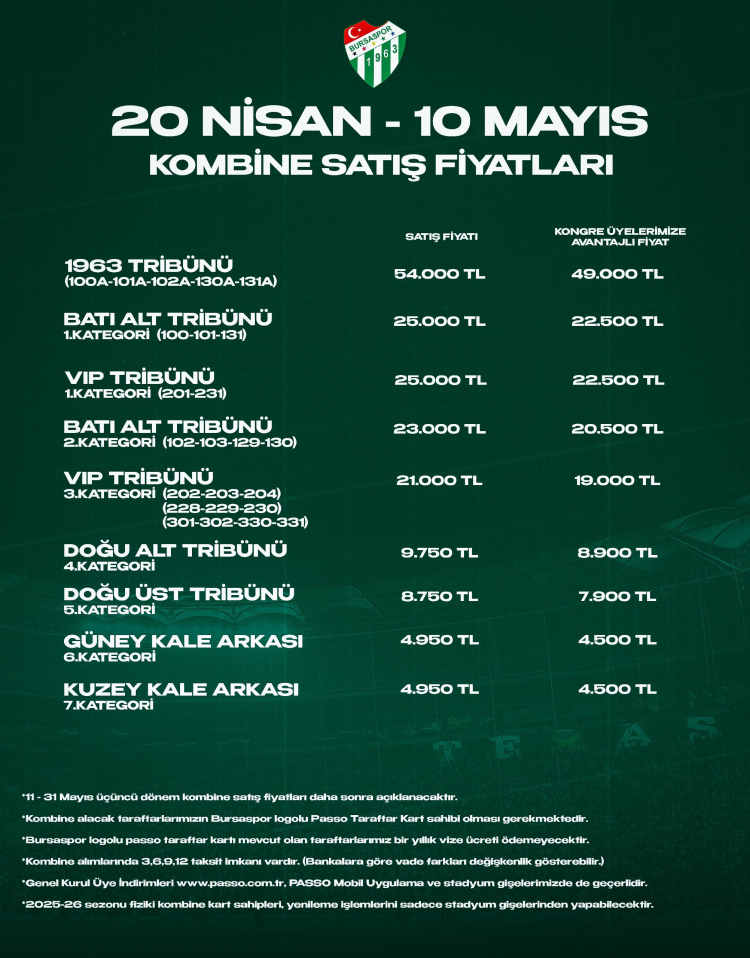 10 Mayıs’a kadar sürecek satış döneminde kombine fiyatları koltuk konumuna göre değişiklik gösteriyor. Kongre üyelerine özel avantajlı fiyatlar sunulurken, satışa çıkan kombinelerde: