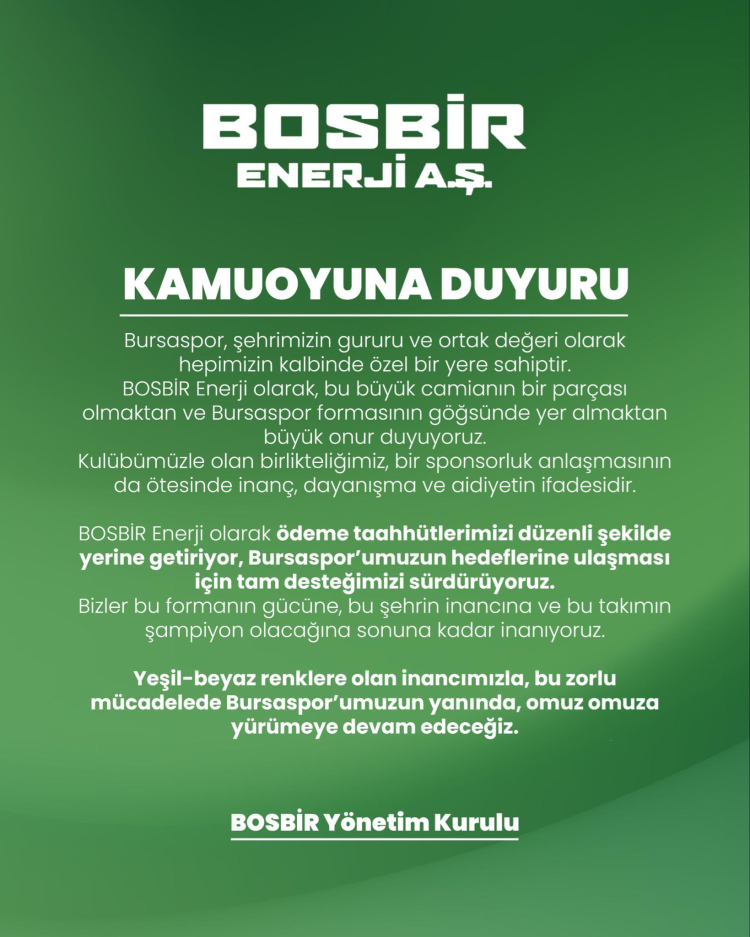 “BOSBİR Enerji olarak ödeme taahhütlerimizi düzenli şekilde yerine getiriyor, Bursaspor’umuzun hedeflerine ulaşması için tam desteğimizi sürdürüyoruz. Bizler bu formanın gücüne, bu şehrin inancına ve bu takımın şampiyon olacağına sonuna kadar inanıyoruz.”