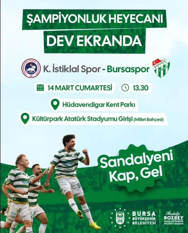 Bursaspor, İkinci Lig'in 28. haftasında Akedaş Kahramanmaraş İstiklal Spor ile deplasmanda karşılaşacak. Bursa Büyükşehir Belediyesi, 14 Mart Cumartesi 13.30'daki maç için Hüdavendigar Kent Parkı'na ve Atatürk Stadyumu Meydanı'na dev ekran kuracak.