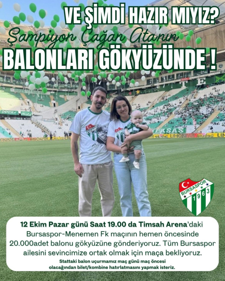 Bursa'da ikamet eden Aleyna ve Ahmet Miraç Taran ailesinin 6 aylık bebekleri Çağan Ata'a 18 günlükken SMA'nın en yaygın ve ağır türü olan Tip-1 (Werdnig-Hoffmann) teşhisi konuldu. Taran çifti, valilik onayıyla başlattığı kampanyada mutlu sona ulaştı. Bu süreçte önemli bir destek sağlayan Bursaspor eski yöneticisi Hakan Dinçtürk, koordinesinde önemli bir etkinliğe imza atılacak. Pazar akşamı saat 19.00'da Atatürk Spor Kompleksi Matlı Stadyumu'nda oynanacak olan Bursaspor-Menemen FK maçında Çağan Ata için 20 bin balon gökyüzüyle buluşacak.