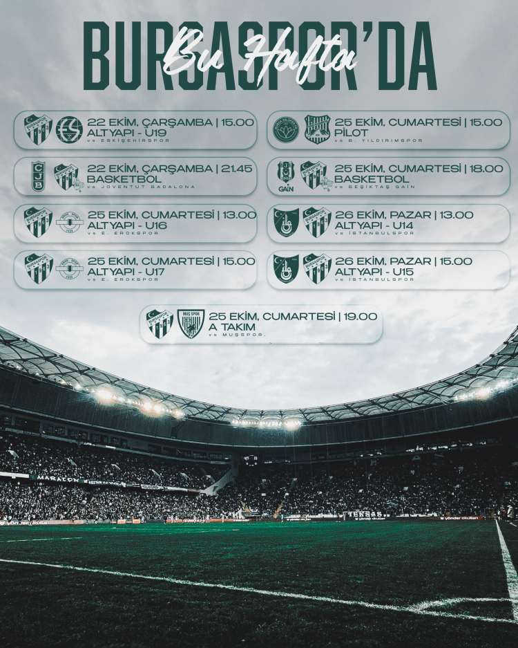 Bursaspor, 22–26 Ekim haftasında futbol ve basketbol branşlarında yoğun bir maç trafiğine hazırlanıyor.