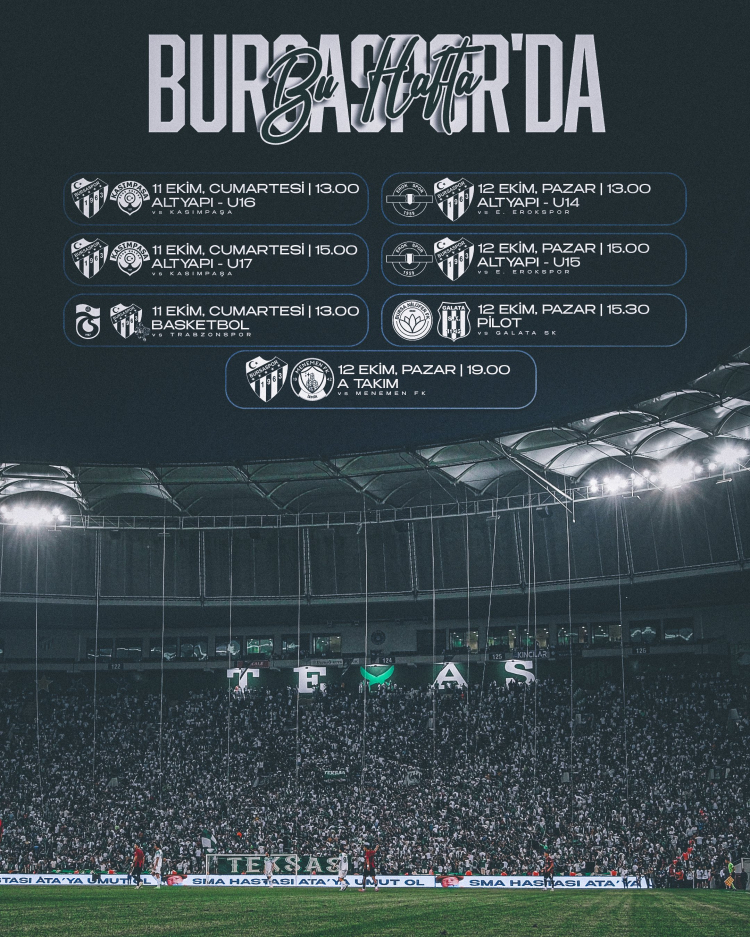 Bursaspor, farklı takımlarıyla yoğun bir hafta geçiriyor. U16 ve U17 takımları Kasımpaşa ile, basketbol takımı Trabzonspor ile karşılaşacak. U14 ve U15 Erokspor ile, Pilot Takım Galata SK ile mücadele edecek. A Takım, Menemen FK'yı konuk edecek.
