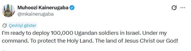 Kainerugaba, Uganda ordusunun İsrail için göreve hazır olduğunu belirterek, “100 bin Uganda askerini İsrail’de seferber etmeye hazırım” dedi. Açıklamasında bu desteğin arkasında dini motivasyonların bulunduğunu da vurguladı.
