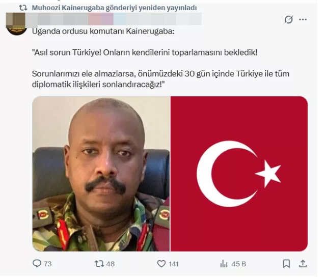 Ugandalı komutanın açıklamaları bununla da sınırlı kalmadı. Türkiye’yi “asıl sorun” olarak nitelendiren Kainerugaba, iki ülke arasındaki ilişkilerle ilgili sert ifadeler kullandı. Sorunların çözülmemesi halinde diplomatik ilişkilerin kesilebileceğini öne süren Kainerugaba, Türkiye’ye 30 gün süre verdiklerini iddia etti.