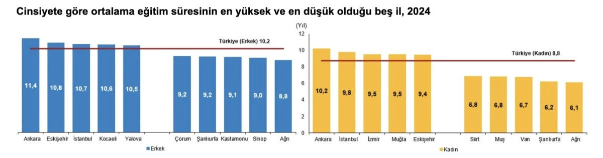 25 yaş ve üzeri nüfusun ortalama eğitim süresinin 2024 yılında en yüksek olduğu il 10,8 yıl ile Ankara olurken, bu ili sırasıyla İstanbul, Eskişehir, Kocaeli ve İzmir takip etti.