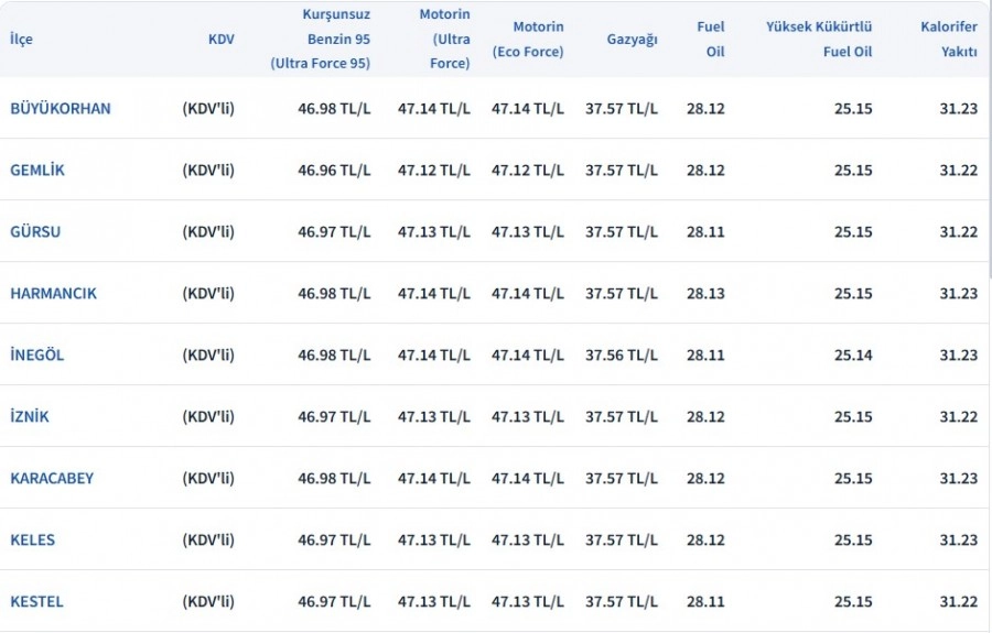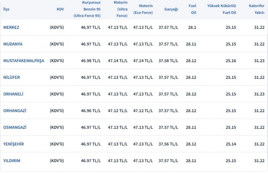 Bursa'da akaryakıt fiyatları