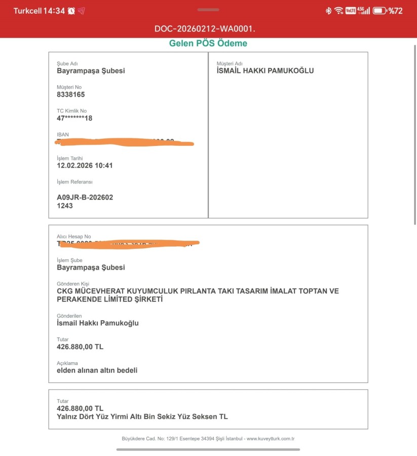 Saat 10.40'ta hesabına 426 bin lira yattığını kaydeden Pamukoğlu, "Büyük ihtimalle bir altın alışverişinden dolayı yanlış birinin hesabına gittiğini düşündüm. Şu ana kadar ki kanım buydu ama kuyumcunun bunu inkar etmesi bambaşka bir boyuta taşıdı olayı" dedi.