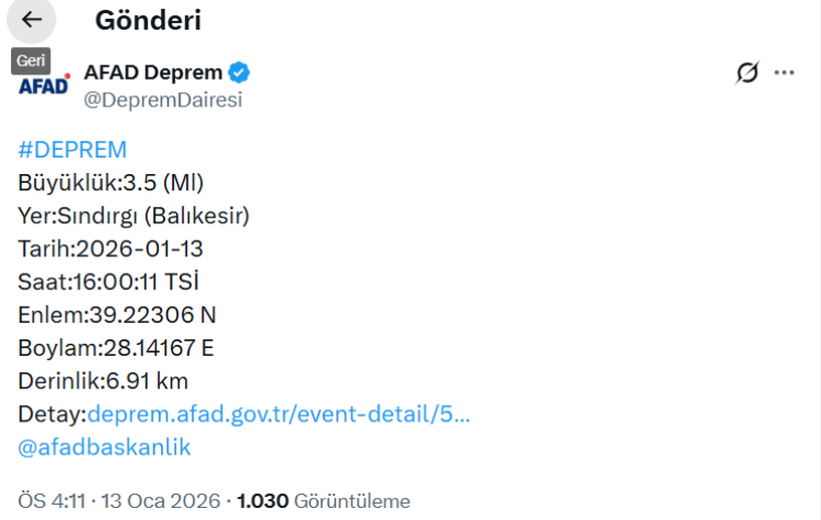 AFAD verilerine göre, Balıkesir'in Sındırgı ilçesinde 3.5 büyüklüğünde deprem meydana geldi.