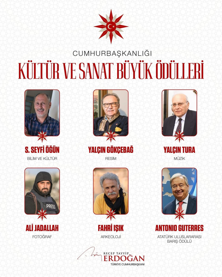Cumhurbaşkanı Erdoğan, Cumhurbaşkanlığı Külliyesi Sergi Salonu'nda düzenlenen programda, "Bilim ve Kültür" dalında akademisyen Prof. Dr. Süleyman Seyfi Öğün'ün, "Resim" dalında Yalçın Gökçebağ'ın, "Müzik" dalında besteci Yalçın Tura'nın, "Anadolu Arkeolojisi" dalında arkeolog ve akademisyen Prof. Dr. Fahri Işık'ın, "Fotoğraf" dalında ise Gazze'de görev yapan AA foto muhabiri Ali Jadallah'ın ödüle değer görüldüğünü bildirdi.