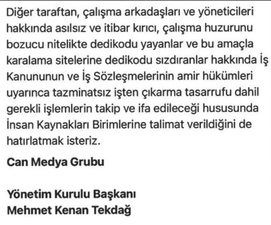 Habertürk Genel Yayın Yönetmeni Mehmet Akif Ersoy'un tutuklandığı uyuşturucu soruşturması medya dünyasında depreme yol açtı. Taciz iddiaları ise gündeme bomba gibi düştü. Kadın spikerlerin bu konudaki şikayetlerini hem İnsan Kaynakları birimine hem de yönetici Kenan Tekdağ'a ilettiği öğrenildi. Ancak Tekdağ'ın kurum içinde tehdit içerikli bir mesaj göndererek taciz iddialarını örtbas etmeye çalıştığı öne sürüldü. İşte çalışanlara gönderilen o mesaj...