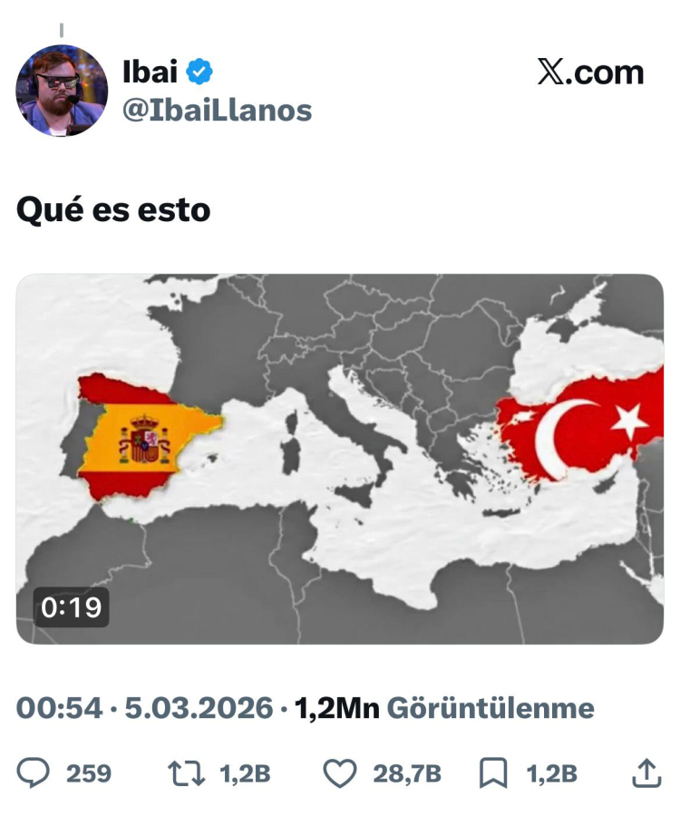 İspanyol yayıncı ve sosyal medya fenomeni Ibai Llanos, Türkiye’ye yönelik yaptığı paylaşımla sosyal medyada gündem oldu. X platformunda yaptığı paylaşımda Akdeniz haritası üzerinde Türkiye ve İspanya’yı gösteren bir görsel kullanan Llanos, “Qué es esto” (Bu ne?) notunu düşerek dikkat çekti.