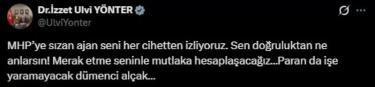"MHP'ye sızan ajan seni her cihetten izliyoruz. Sen doğruluktan ne anlarsın! Merak etme seninle mutlaka hesaplaşacağız... Paran da işe yaramayacak dümenci alçak..." ifadelerini kullandı.