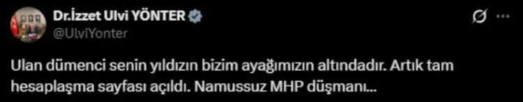 Yönter, bu paylaşımından saatler sonra da "Ulan dümenci senin yıldızın bizim ayağımızın altındadır. Artık tam hesaplaşma sayfası açıldı. Namussuz MHP düşmanı" mesajını paylaştı.