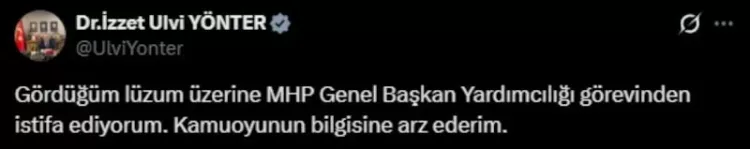 MHP Genel Başkan Yardımcısı İzzet Ulvi Yönter, görevinden istifa ettiğini duyurdu. Yönter, 'gördüğü lüzum üzerine' istifa ettiğini belirtti.